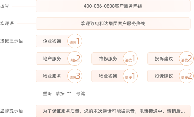 地产效劳:接听业主从衡宇认购到交付后质保期内全生命周期的咨询及投诉电话,,,,,并提供响应效劳。。。。。。。。包括销售效劳类和交付效劳类投诉咨询,,,,,以及交付后质保期内业主的户内报修类电话。。。。。。。。统一接派、跟踪、处置惩罚、回访,,,,,凭证电话内容反响给相关部分举行处置惩罚,,,,,跟踪直至关闭问题,,,,,并举行客户回复确认;;;;;;;;